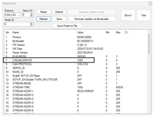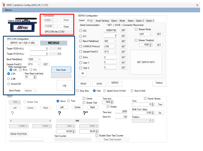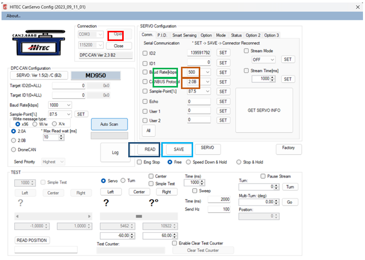 (BLUE) Configure the CAN bus communication settings. The default CAN settings for the servos are: