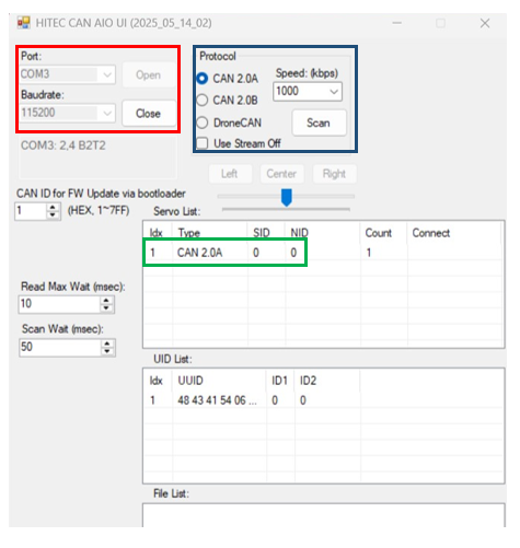 Under Protocol, set the Baudrate of the servo, select the protocol in use and click Scan (BLUE). If one or both values aren’t available, the servo will be detected automatically using the scan function.