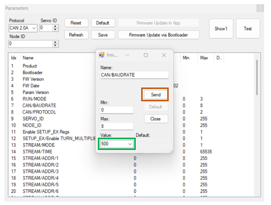 Double click CAN/BAUDRATE (GRAY) to open the setting window.