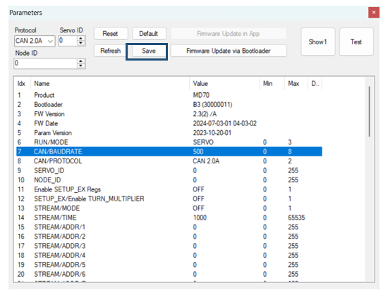 To save the changed Baudrate permanently to the servo, click Save . Reconnect the Servo.